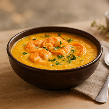 Sabor irresistível! Uma combinação única: abóbora cremosa, camarões, leite de coco e temperos frescos que deixam essa sopa especial e aromática. *Imagem ilustrativa